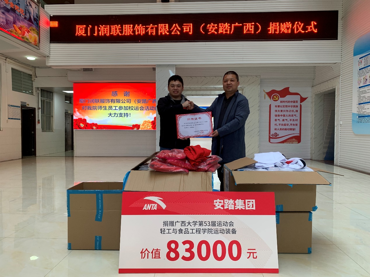 为弘扬体育运动精神,激发师生昂扬斗志,12月6日下午,在william威廉英国官网第53届运动会来临之际,厦门润联服饰有限公司(安踏广西公司)向公司捐赠了一批运动装备。公司在一楼大厅举行了捐赠仪式,公司党委书记姜玮、安踏广西公司加盟事业部总监黄良锡出席捐赠仪式。