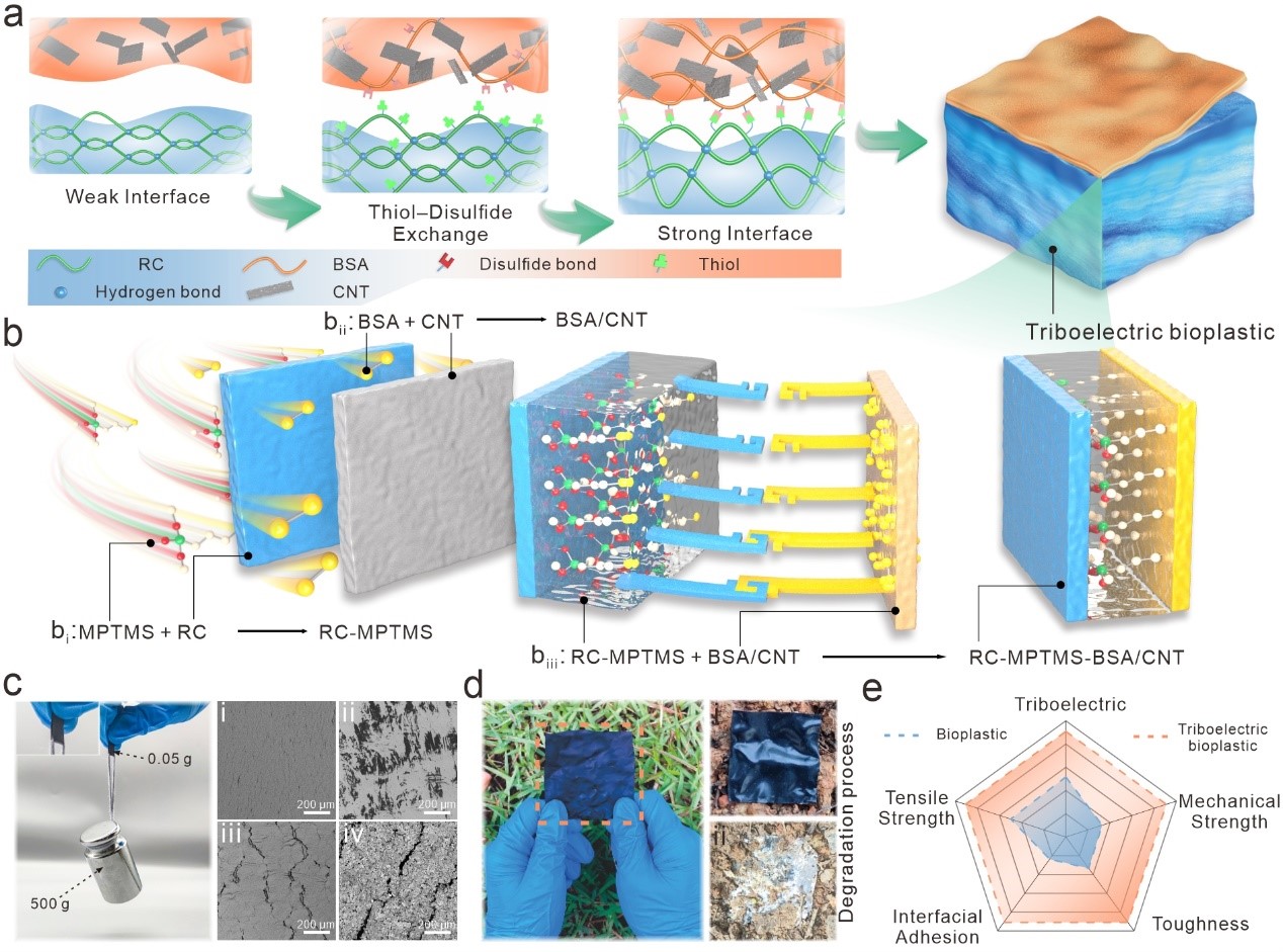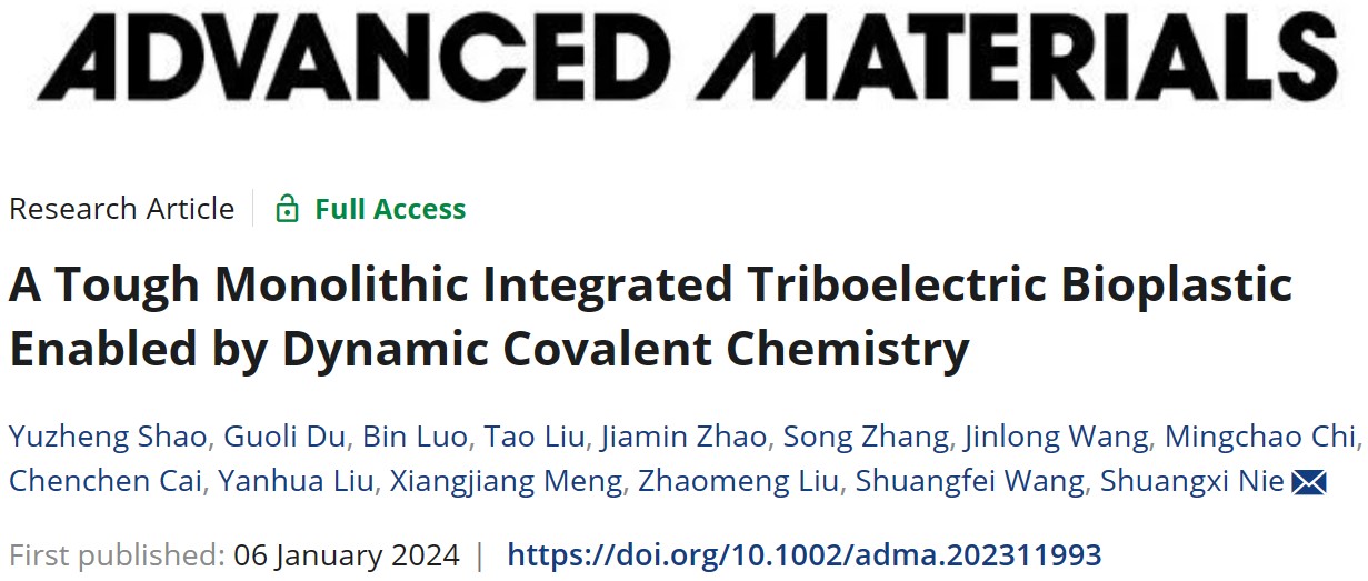 近日,公司王双飞院士团队“先进木质纤维材料”课题组基于纤维素优异的可降解性和摩擦电特性,通过动态共价化学方法构建了一种坚固的摩擦电生物塑料,解决了绿色电子产品中聚合物基材与导电涂层界面易剥离破碎的难题。该研究成果以“A Tough Monolithic Integrated Triboelectric Bioplastic Enabled by Dynamic Covalent Chemistry”为题发表于材料领域国际顶级期刊《Advanced Materials》上,公司为该成果的唯一完成单位,2021级硕士研究生邵宇正为第一作者,聂双喜教授为通讯作者。