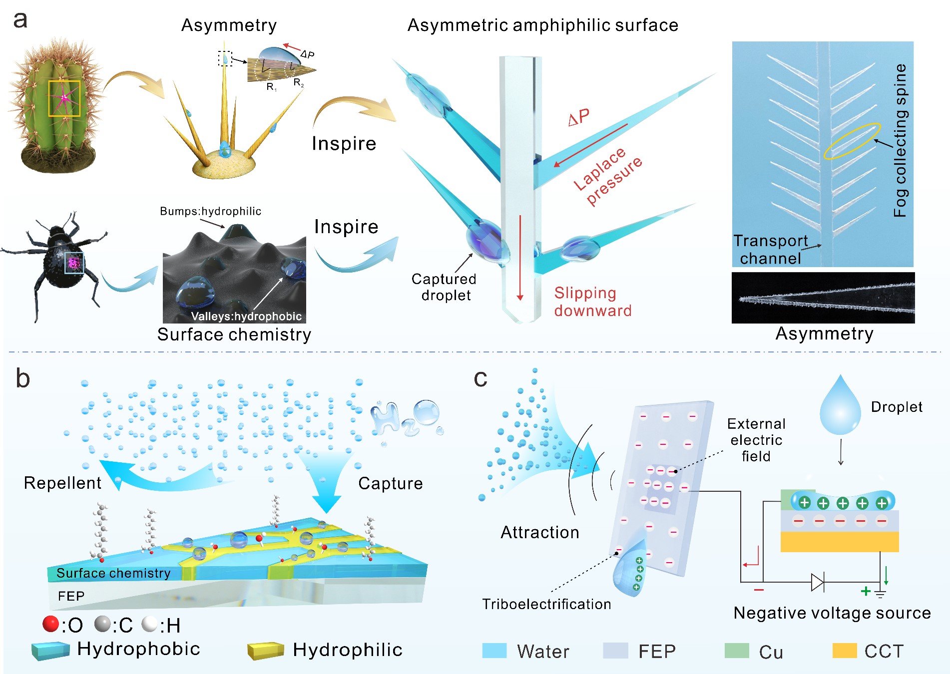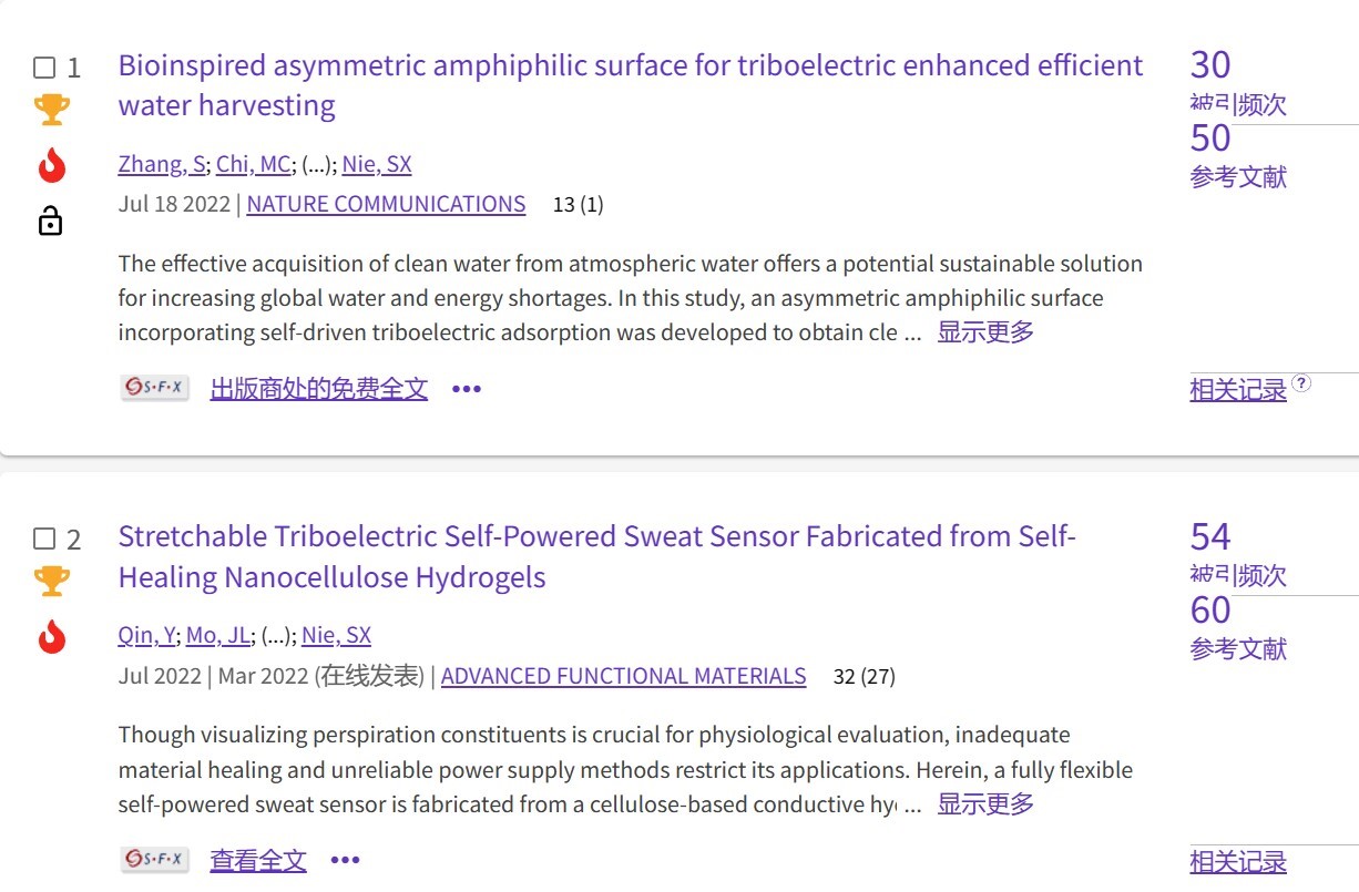 轻工技术与工程专业2021级博士生张松等人从仙人掌刺和甲虫翅翘结构获得灵感,构造了双重仿生结构以实现液滴快速凝结和去除。首次揭示了水收集表面与液滴之间的界面电荷相互作用,并将其应用于大气水收集,实现了前所未有的极高水收集效率。相关研究成果于2022年7月18日以题为“Bioinspired asymmetric amphiphilic surface for triboelectric enhanced efficient water harvesting”在线发表于《Nature Communications》。论文链接/index.html