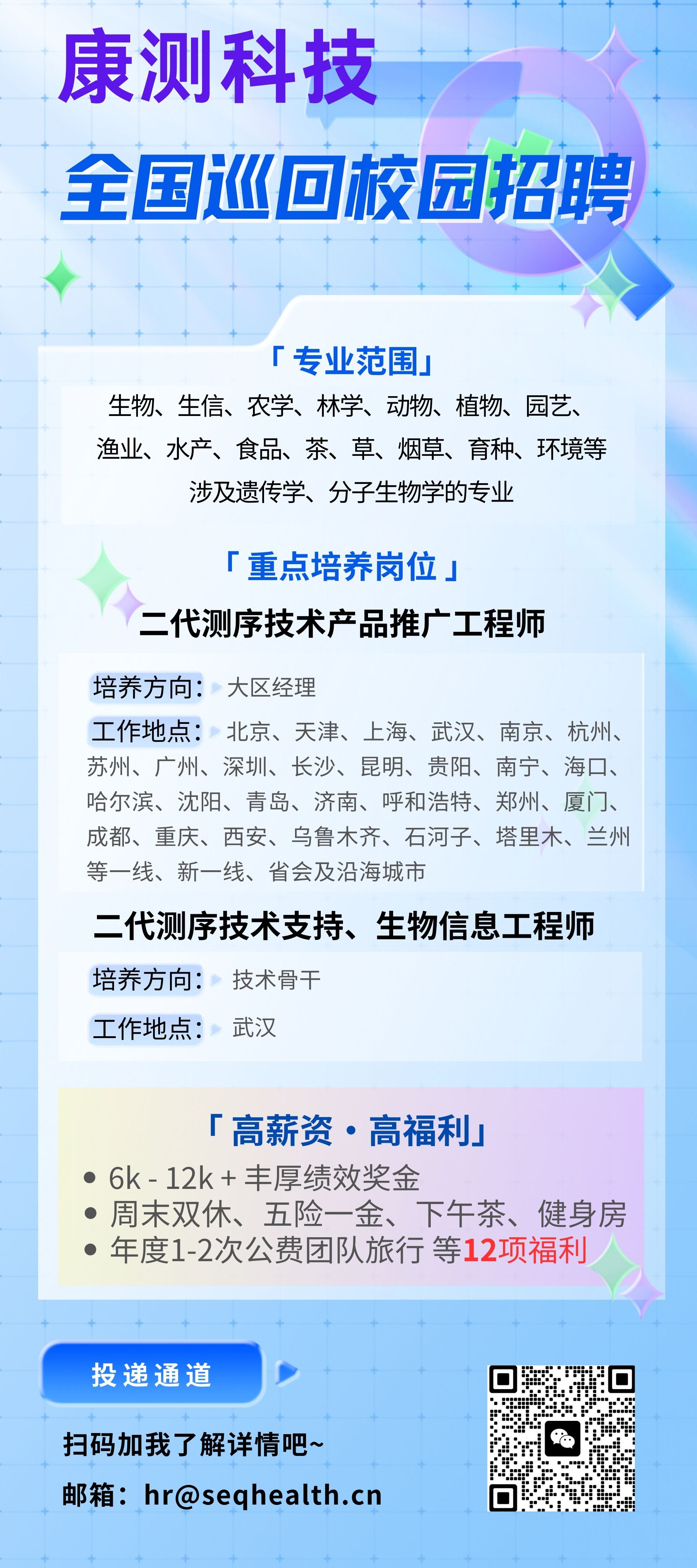 康测科技校园招聘(全国巡回)宣讲会(内附资深HR揭秘实操就业tips) (qq.com) 宣讲时间:2024.10.14/15:00宣讲地点:william威廉英国官网农公司306教室线上投递渠道:hr@seqhealth.cn 我们在这里等你加入!农公司、林公司、理公司、生物、分子生物、遗传、植保、动医、动科、园艺、基因相关院系及专业都可投递。