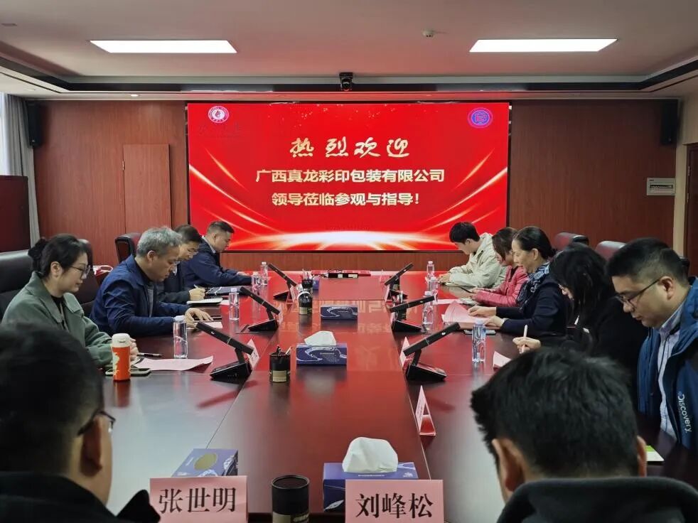 仪式开始前,广西真龙彩印包装有限公司副总经理韦典进一行在公司黄崇杏教授的陪同下,参观了公司展厅与包装工程相关实验室,实地了解公司的科研平台与创新成果。
