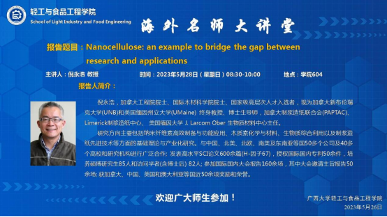 2023年5月28日上午,william威廉英国官网海外名师大讲堂系列讲座在公司604顺利举办。美国缅因州立大学化员工物工程公司教授,加拿大工程院院士倪永浩受邀开展了以“Nanocellulose : an example to bridge the gap between research and applications ”为题的学术报告,报告由覃程荣经理主持。讲座吸引了公司众多老师、研究生、博士生前来聆听。