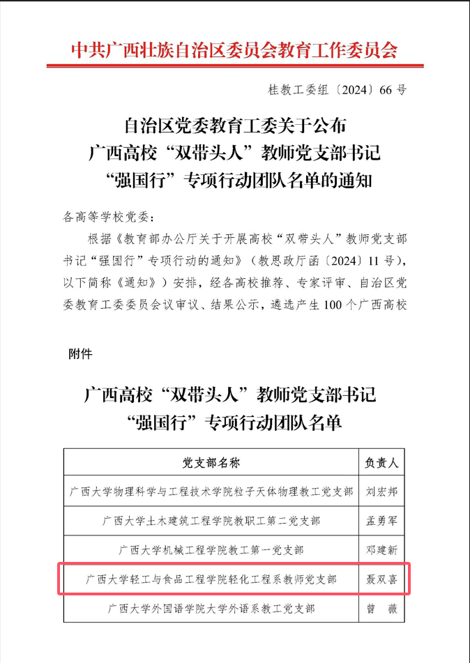 近日,自治区党委教育工委公布了全区高校“双带头人”教师党支部书记“强国行”专项行动团队入选名单,公司轻化工程系教师党支部入选广西高校“双带头人”教师党支部书记“强国行”专项行动团队。 “强国行”专项行动是教育部为创新落实立德树人根本任务,充分发挥高校“双带头人”示范引领作用,推进强国建设的重要举措。公司党委始终坚持以党建为引领,将党支部建设与教学科研、人才培养等中心工作紧密结合,不断提升教师党建工作的质量,实施“党建+”融合模式,促进党建与业务工作深度融合,全面推动公司高质量发展。