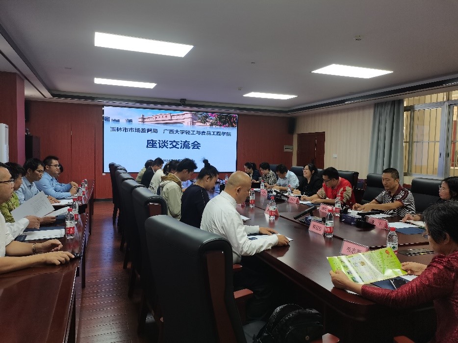 座谈交流会上,陆登俊副经理对玉林市市场监督管理局一行的来访表示欢迎,并介绍了公司学科专业建设发展历程、人才培养特色和近年科研代表性成果等方面的情况。莫萍局长介绍了玉林市近年食品行业的情况、研发过程中遇到的痛点难点问题及今后的合作设想。随后来访各企业负责人介绍了企业的基本概况、未来发展规划、合作需求等情况。随后校企双方就如何进一步推动校企合作、产品创新研发、项目联合申报等方面进行深入研讨。