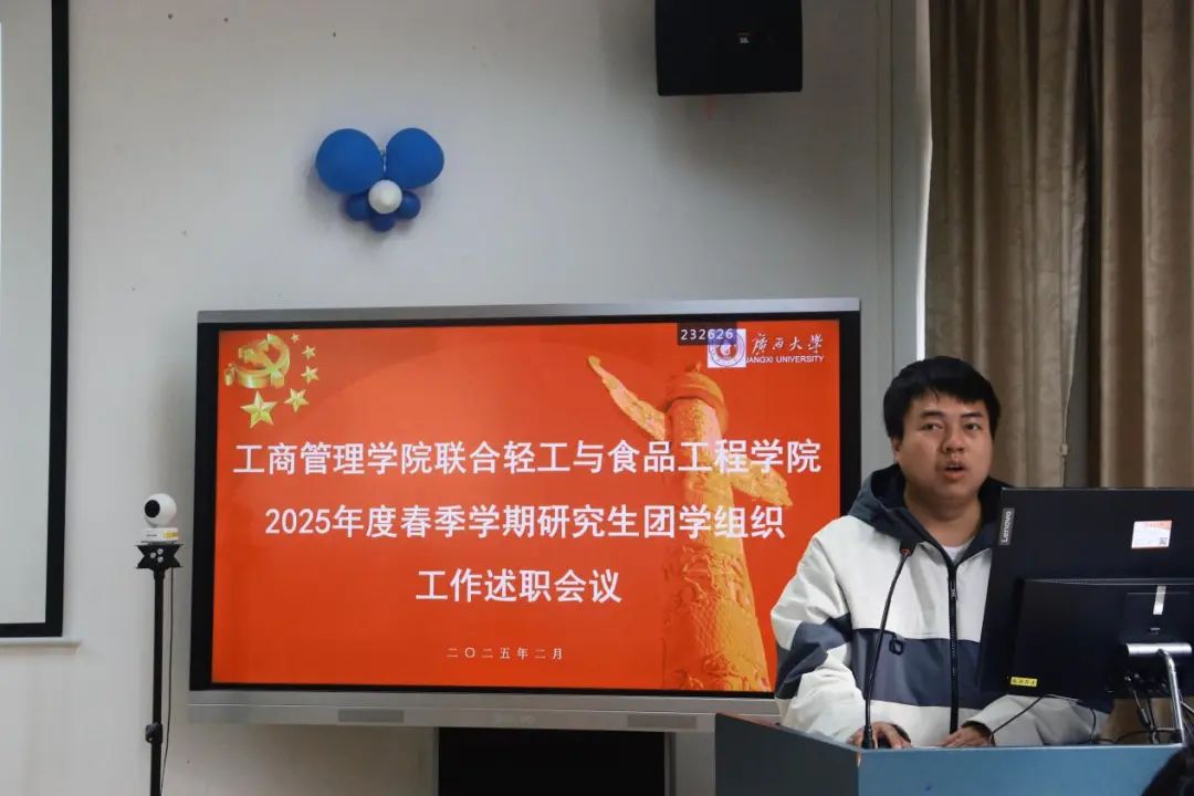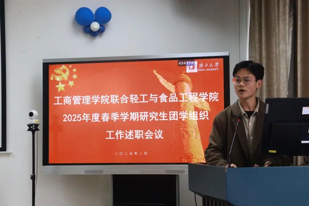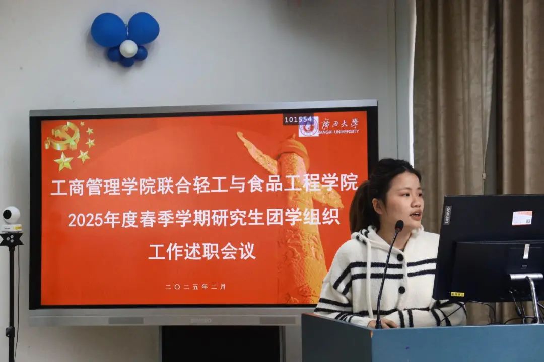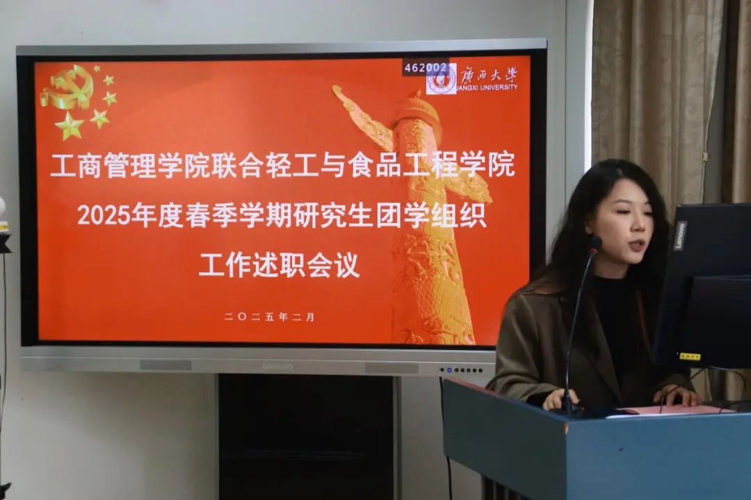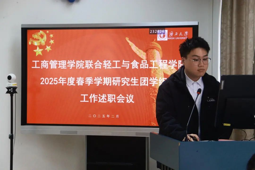 随后,两院研究生团学组织各部门负责人依次述职。工商管理公司党建秘书处、员工团委,以及两院研究生会主席团成员分别汇报工作,涵盖党建、思想引领、团务知识、学术科研、就业服务等方面,以数据和案例总结阶段性成果,并规划未来发展路径。